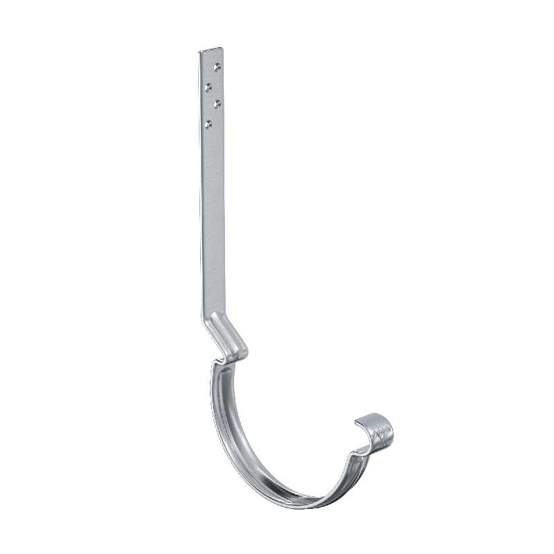 Поставляется с комплектом креплений. Конструкция крюка имеет более вытянутое и глубокое ребро жесткости, поэтому крюк выдерживает повышенные силовые нагрузки. Передний замок крюка фиксирует завиток желоба снаружи, и благодаря этому желоб удобно монтировать даже после установки фартука-капельника. Задний замок имеет конструкцию, исключающую смещение желоба под нагрузкой. Отверстия под крепеж выполнены с зенковкой под шляпку в потай. На передней части крюка расположен фирменный штамп - лилия.