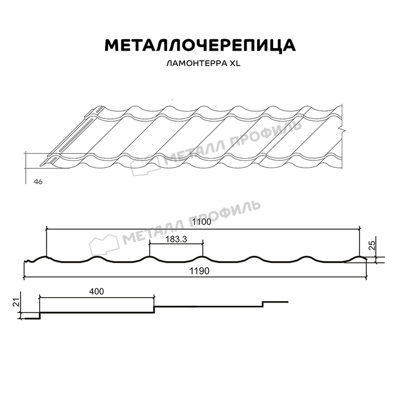 Если вам нужна классическая металлочерепица для больших кровель, обратите внимание на Ламонтерра® XL. Она характеризуется увеличенными габаритами: расстояние между волнами — 400 мм, высота ступенек — 21 мм. Большие асимметричные волны акцентируют геометрию ската и сделают крышу ещё более выразительной.
